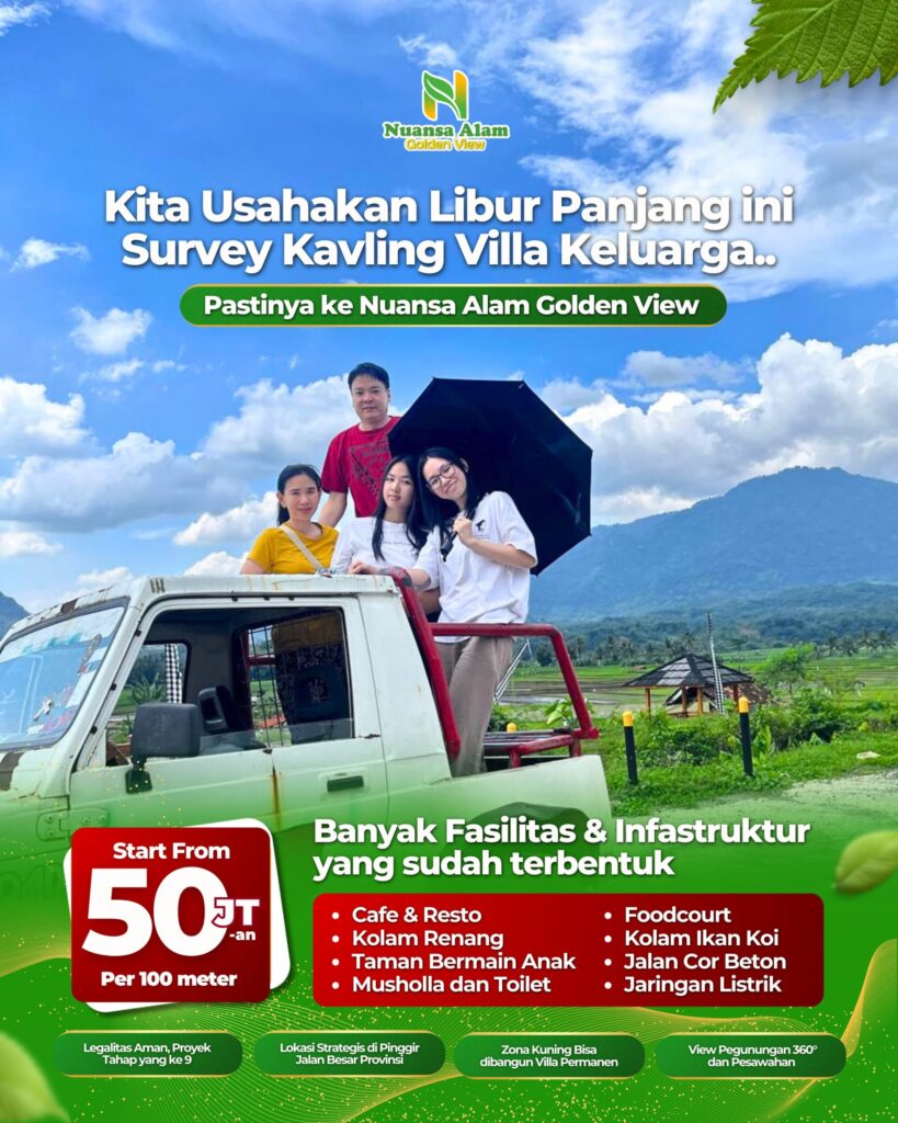 NUANSA ALAM GOLDEN VIEW adalah kavling Project ke-9 dari PT Usaha Menuju Indoberkah. Konsep kawasan hunian / villa yang mempertahankan keindahan alam yang natural. DIkelilingi pemandangan pegunungan khas Bogor Timur dan sawah serta city light view di waktu malam.